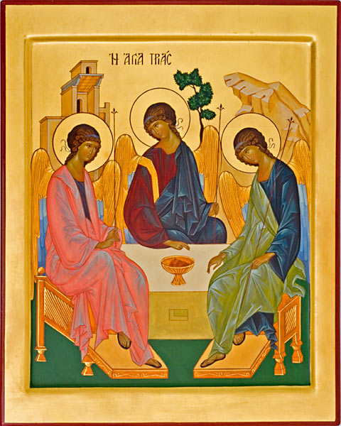 Sur la très célèbre icône de la Trinité d’André Roublev, c’est Sa Sainte Face, la Sainte Face du Linceul, que le Christ voit se mirer dans la coupe (l’ange à notre droite).
